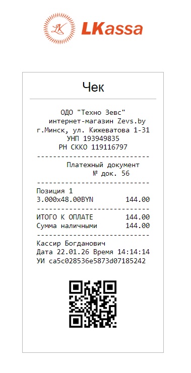 Электронный чек об оплате программной кассы LKassa